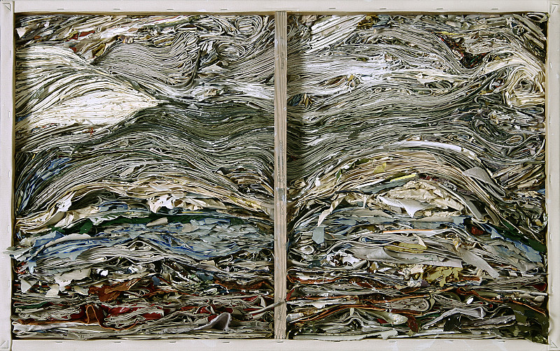 Reclaimed spent paint, collected from artists both renowned and unknown, reconstituted, and stacked into the reverse of a canvas.