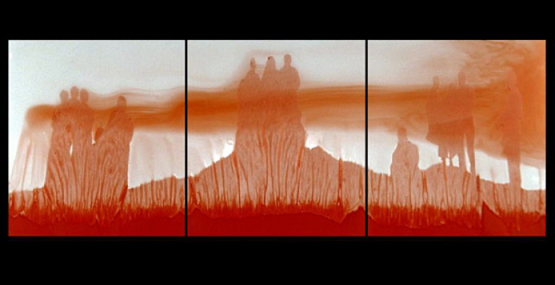 In Searle's video installation and prints, silhouettes of groups of family members in the photographs, cut out of red crêpe paper, float in warm water. Their colour bleeds as the water ebbs and flows, the figures become transparent and residual, and the structured and defined shapes slowly losing their form amidst the swirls of red ink. Our personal associations with this elegiac and enigmatic imagery are myriad.
