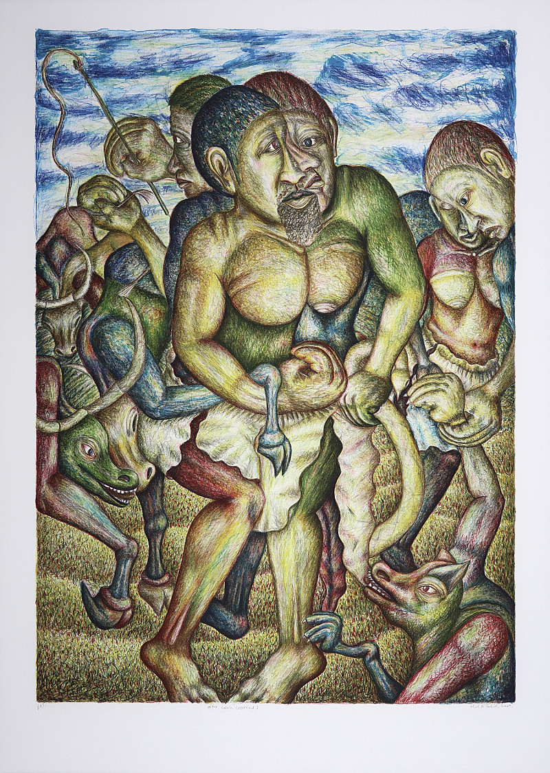 In the bottom right hand corner of the print is an animal. "It is an animal holding her dress, trying to prevent her from doing bad stuff. It is a helping animal." Mmakgabo Helen Sebidi, 2009