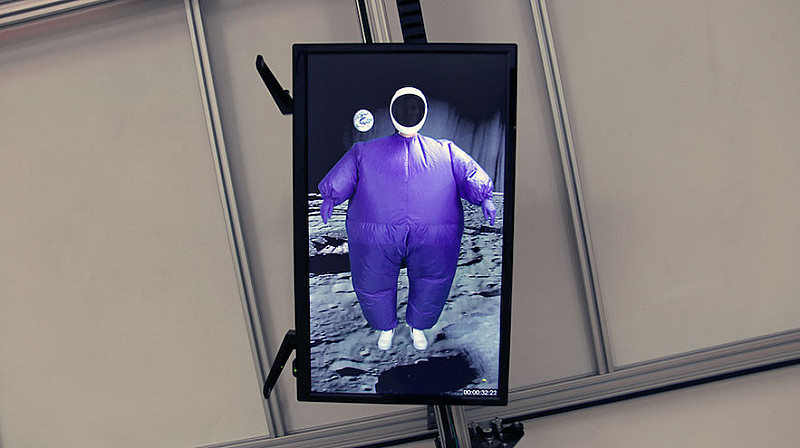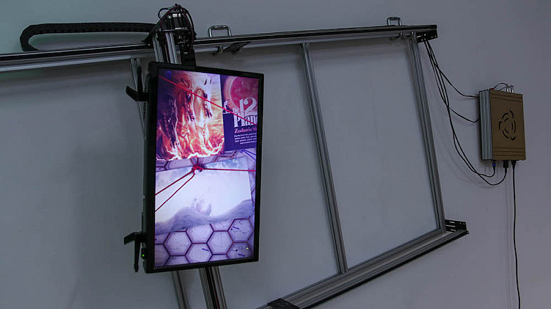 Single channel videowith sound on moving aluminium sculpture, with TV and motor control system.