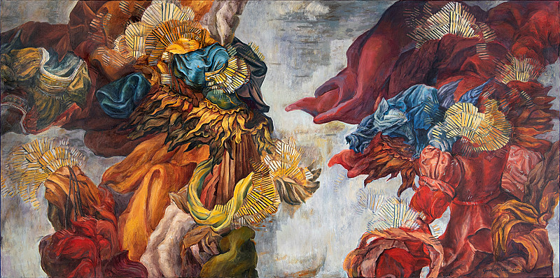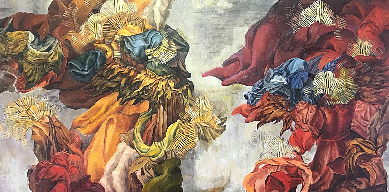 This painting affirms my fascination with the spectacle of neo-baroque aesthetics as well as reflecting my intention to remind the viewer of mortality in the face of grandeur. The reflection on humanity that offers conflicting messages, embellished emptiness, or simply less than we expect, is entrenched in history. Like the carnival that allows a riotous atmosphere, this work borrows fragments from unrelated art sources to create this trancelike reconstructed world.