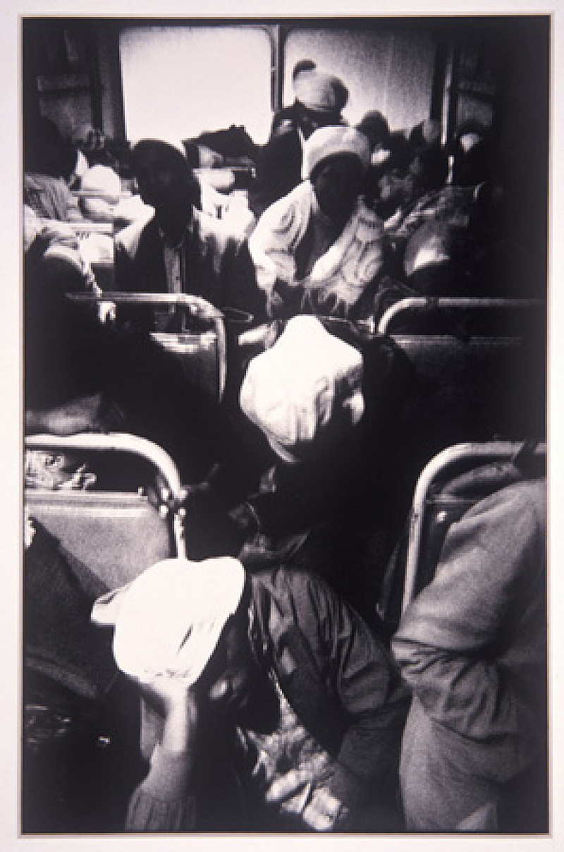 Goldblatt’s photographic essay on homeland transport, The Transported of KwaNdebele, 1983–1984, illuminates the oppressive geographic displacement imposed by apartheid. Commissioned for the Second Carnegie Inquiry into Poverty and Development in Southern Africa, these photographs depict the commuting workers of KwaNdebele, who spend between 3 1⁄2 and 8 hours each day traveling to and from their jobs in the metropolitan city of Pretoria. As apartheid policy required the segregation of black South Africans in tribal Bantustans or homelands, millions were forcibly relocated to remote, rural settlement camps that lacked employment opportunities. Heavily subsidized bus and rail services were established to facilitate the movement of workers between these camps and their workplaces in the country’s white economic centers. Goldblatt’s images follow KwaNdebele’s nightriders through their daily ritual of interminable, overcrowded commutes on dusty, rutted roads and render visible their physical and psychological experiences of alienation and dislocation. The bus ride alone speaks powerfully to the abhorrent conditions which so profoundly concern Goldblatt.