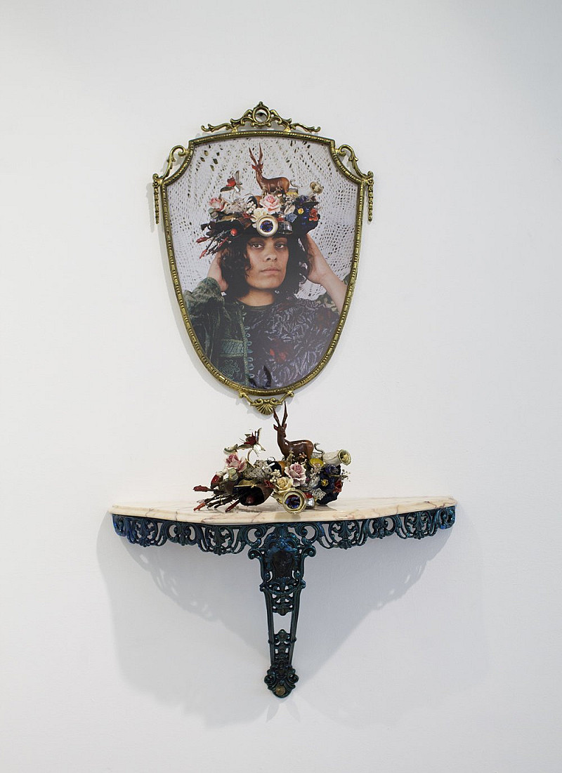 Mixed media relief sculpture: resin, found objects, imitation gold leaf, enamel paint and spray paint
