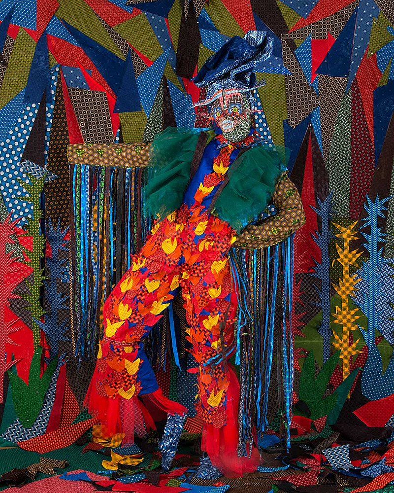 I am interested in re-imagining objects, bodies and landscapes that are constructed to immerse us in the logic of another place, an imagined reality. For futures to exist, the future must be conceived through revision, looking back. The present must understood as a transitional or as a rite of passage, a process of evolving. I express modes of transformation and shifts through the broken and cut and re-assembled. I have adopted visual abstraction and its intensity to purposefully revolt and to evoke feelings of discomfort or disturbance of the eye. The work is centered in the celebration of my African culture, the grotesque and carnivalesque are brought to the fore. I was taught a very narrow-sided version of my history. The celebration of my roots is prompted through the usage of colour and pattern, they are juxtaposed to create ‘hyper-visible’ and aesthetically stimulating visuals. I celebrate this notion of my African culture and I find ways to visualize the celebration through creating work that transports one to another dimension.”