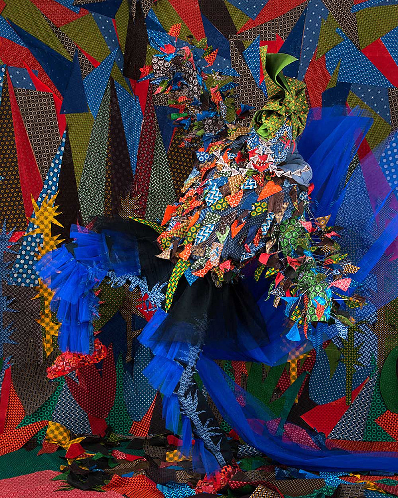 “Ishweshwe reflects a story of trade and cultural interchanges across the continent, of indigenization, cultural revitalization and re-appropriation. The history of wax printed material is a history of colonial trade that saw material culture trafficked through imperial powers to their colonial subjects. As with most things that come with hybridity, the material speaks of the colonial trade route whose conclusion is integral to a particular sense of African identity after liberation from colonial authority. I imagine a world ‘post post colonialism’ called AFRICARDIA, a future land. I imagine its physical landscape, the people who inhabit it, the animal life essentially the most extreme form of hybridization. A fusion. Nature and humans live side by side peacefully. Based on the Arcadian paintings of Henri Rousseau, and Afro-Futurism, the ‘world’ of difference does not exist and hybridity is being taken to a new sense of boundless subjectivity.