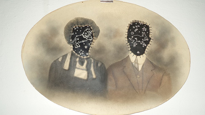 Embroidery on rubber, found altered photograph.