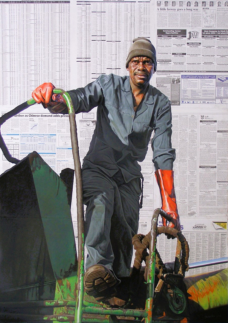 “Sometimes overshadowed by the equipment they use Hugo introduces a level of tension between work and worker. Adding to this tension she plays with the reciprocal gaze established between viewer and viewed. Looking at these workers the viewer becomes the subject of observation!