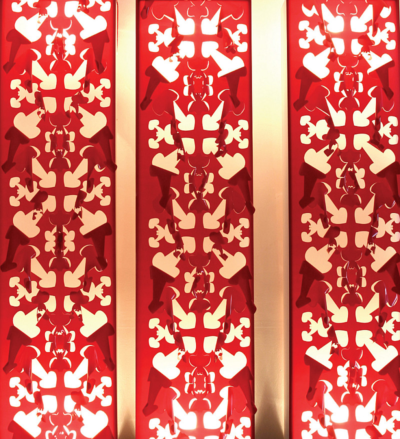The use of repetitive vinyl ‘cut outs’ in this work has compulsive and fetishistic implications and also speaks of the synthetic. (The type of vinyl used for this work also reacts to heat and curls up, it alters it’s shape as the cremaster muscle in the testicles might do). The patterning of Red Obsession is just as playful and attractive as the adorned artists in question but on closer scrutiny may also be perceived as offensive and could be categorized as the sublime of delightful horror.