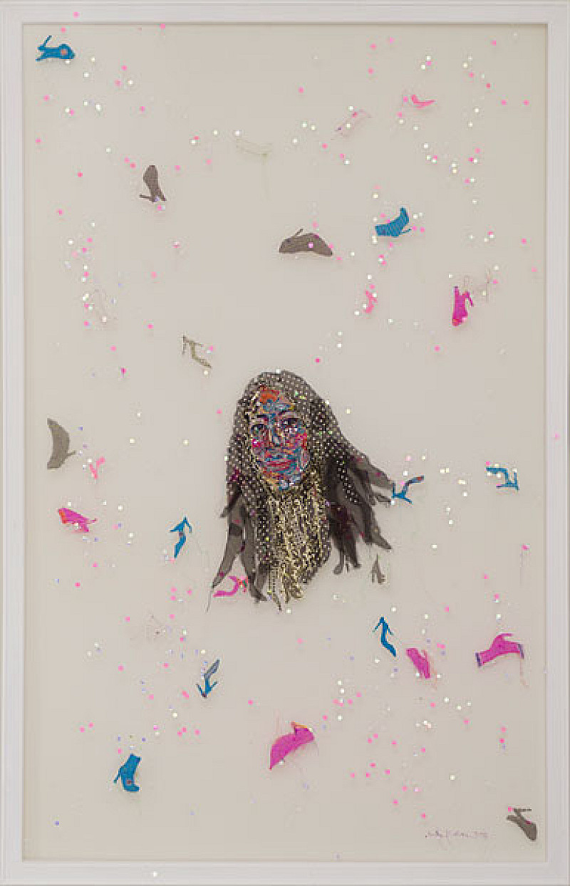 My face is stitched together with fragments of saris and makes an ‘Indian’ face. The reverse of the self-portrait expresses a more nuanced, somewhat abstract form, and I find this a more comfortable reflection of my identity. My portrait, like identity itself, is in transition, unfixed and continually undergoing metamorphosis. I am surrounded by a myriad of western shoes, ‘cut outs’ from saris which together metaphorically express journey, class, caste, modernity, migration, mobility, and freedom.
