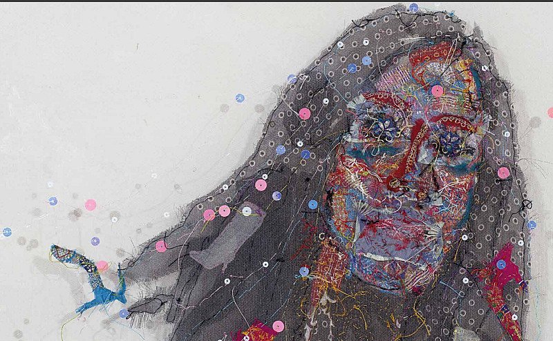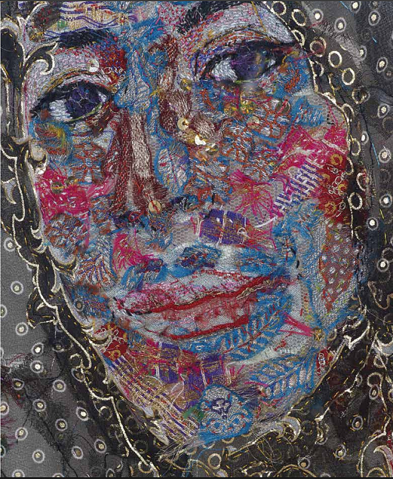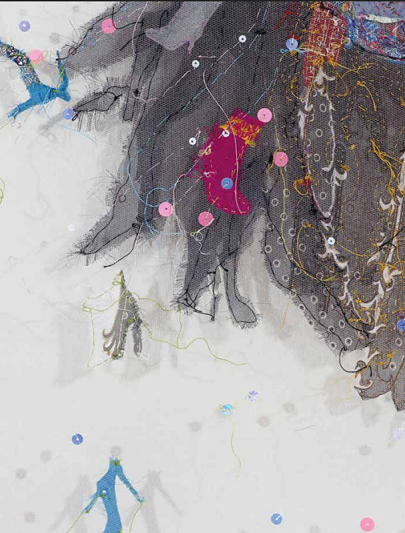 In this work, I reflect on the Hindu philosophy of Maya derived from the Sanskrit ma (‘not’) and ya (‘that’, that is ‘illusion’). Ancient Hindu texts purport that what one sees is true in itself, but untrue when compared to the absolute truth. Maya prompts me to pierce through the veil of illusion to find my true self, to pierce through the veil of my Indian-self in search of my identity. The shiny sequins are mirror-like and self-reflexive, and induce dream-like states of illusion. I have recreated myself from fragments of vintage saris belonging to my late mother. The sari dissected, transformed and reinvented reminds me of loss, and is a symbol of my Indian ancestry and evolving identity. I use my ancestor’s stitches to ‘pin down’ and capture my Self on fragile tulle.