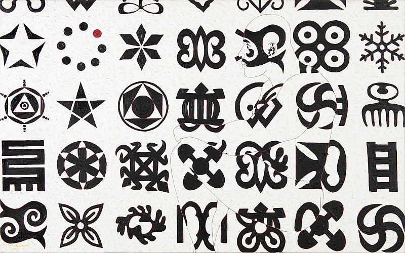 The human figure is central to Owusu-Ankomah's widely heralded practice. In his earlier work, which drew heavily on masquerade and African rock paintings, these stylized male figures were more clearly visible, but over time, have been integrated into a complex fabric of signs that effectively camouflage the figure. These signs describe an actual and fictional cosmology that defines and contextualizes each of Owusu-Ankomah's figures. The signs are a mix of adinkra symbols (commonly in Ghanaian textile design), Chinese pictographs, consumer logos and invented symbols. The titular microcron, for instance, refers to circles of shining orbs and signifies "universes inside universes